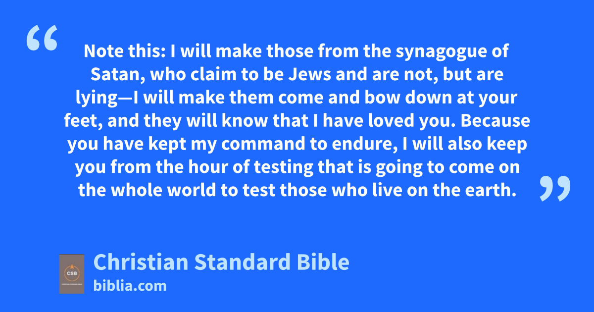 7 “Write to the angel of the church in Philadelphia: Thus says the Holy One, the true one,n the one who has the key of David, who opens and no one will close, and who closes and no one opens:o 8 I know your works. Look, I have placed before you an open door that no one can close because you have but little power; yet you have kept my word and have not denied my name.p 9 Note this: I will make those from the synagogue of Satan, who claim to be Jews and are not, but are lying—I will make them come and bow down at your feet,q and they will know that I have loved you.r 10 Because you have kept my command to endure, I will also keep you from the hour of testings that is going to come on the whole world to test those who live on the earth.t 11 I am coming soon.u Hold on to what you have,v so that no one takes your crown.w