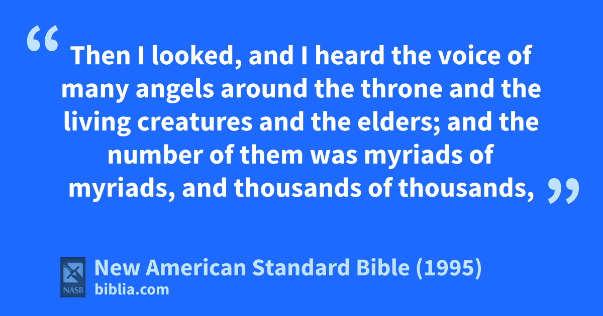 11 Then I looked, and I heard the voice of many angels aaround the throne and the bliving creatures and the celders; and the number of them was dmyriads of myriads, and thousands of thousands,