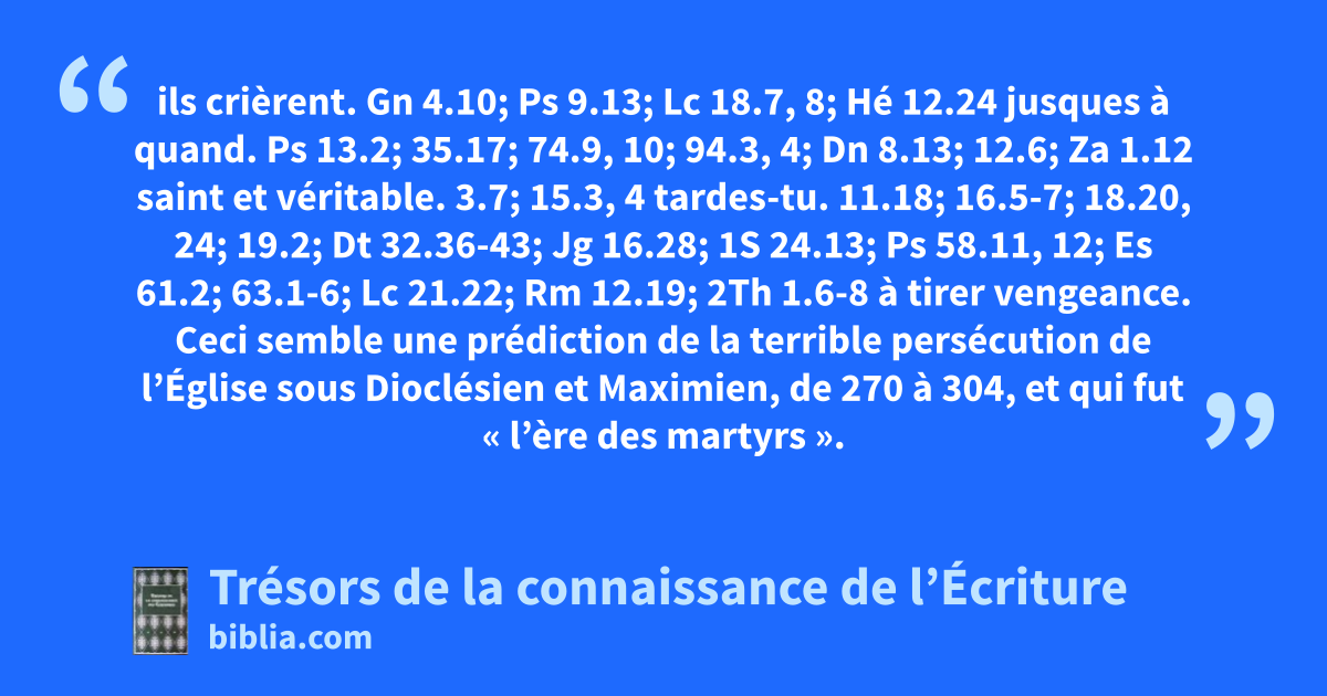 ils crièrent. Gn 4.10; Ps 9.13; Lc 18.7, 8; Hé 12.24 jusques à quand. Ps 13.2; 35.17; 74.9, 10; 94.3, 4; Dn 8.13; 12.6; Za 1.12 saint et véritable. 3.7; 15.3, 4 tardes-tu. 11.18; 16.5-7; 18.20, 24; 19.2; Dt 32.36-43; Jg 16.28; 1S 24.13; Ps 58.11, 12; Es 61.2; 63.1-6; Lc 21.22; Rm 12.19; 2Th 1.6-8 à tirer vengeance. Ceci semble une prédiction de la terrible persécution de l’Église sous Dioclésien et Maximien, de 270 à 304, et qui fut « l’ère des martyrs ».