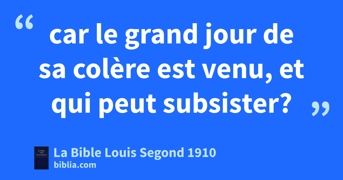 12Je regardai, quand il ouvrit le sixième sceau; et il y eut un grand tremblement de terre, ele soleil devint noir comme un sac de crin, la lune entière devint comme du sang, 13et les étoiles du ciel tombèrent sur la terre, comme lorsqu’un figuier secoué par un vent violent jette ses figues vertes. 14Le ciel se retira comme un livre qu’on roule; et toutes les montagnes et les îles furent remuées de leurs places. 15Les rois de la terre, les grands, les chefs militaires, les riches, les puissants, tous les esclaves et les hommes libres, se cachèrent dans les cavernes et dans les rochers des montagnes. 16Et ils disaient aux montagnes et aux rochers: fTombez sur nous, et cachez-nous devant la face de celui qui est assis sur le trône, et devant la colère de l’agneau; 17car le grand jour de sa colère est venu, et qui peut subsister?