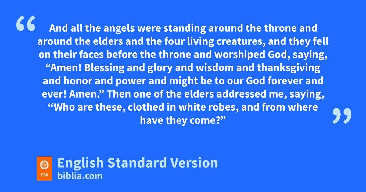 9 After this I looked, and behold, ba great multitude that no one could number, cfrom every nation, from all tribes and peoples and languages, standing before the throne and before the Lamb, dclothed in white robes, with epalm branches in their hands, 10 and crying out with a loud voice, f“Salvation belongs to our God who sits on the throne, and to the Lamb!” 11 And all the angels were standing around the throne and around the elders and gthe four living creatures, and they hfell on their faces before the throne and worshiped God, 12 isaying, “Amen! Blessing and glory and wisdom and thanksgiving and honor and power and might be to our God forever and ever! Amen.”