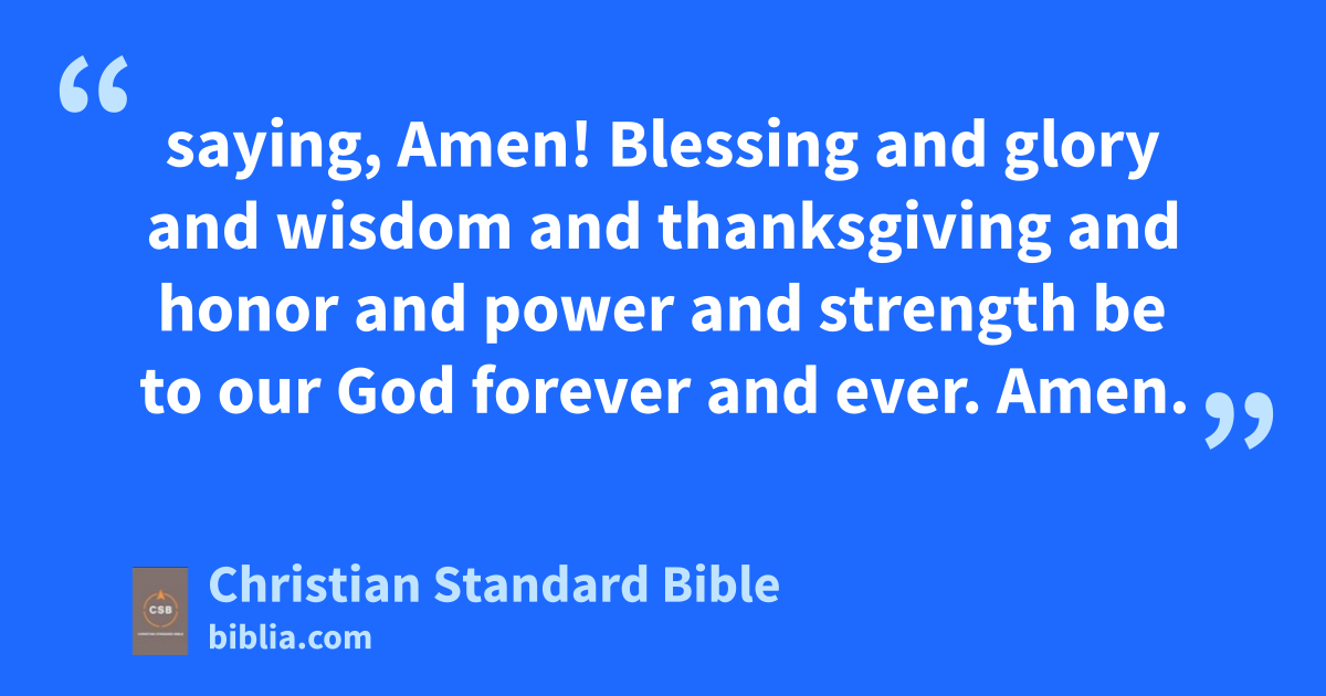 11 All the angels stood around the throne, and along with the elders and the four living creatures they fell facedown before the throne and worshiped God, 12 saying,