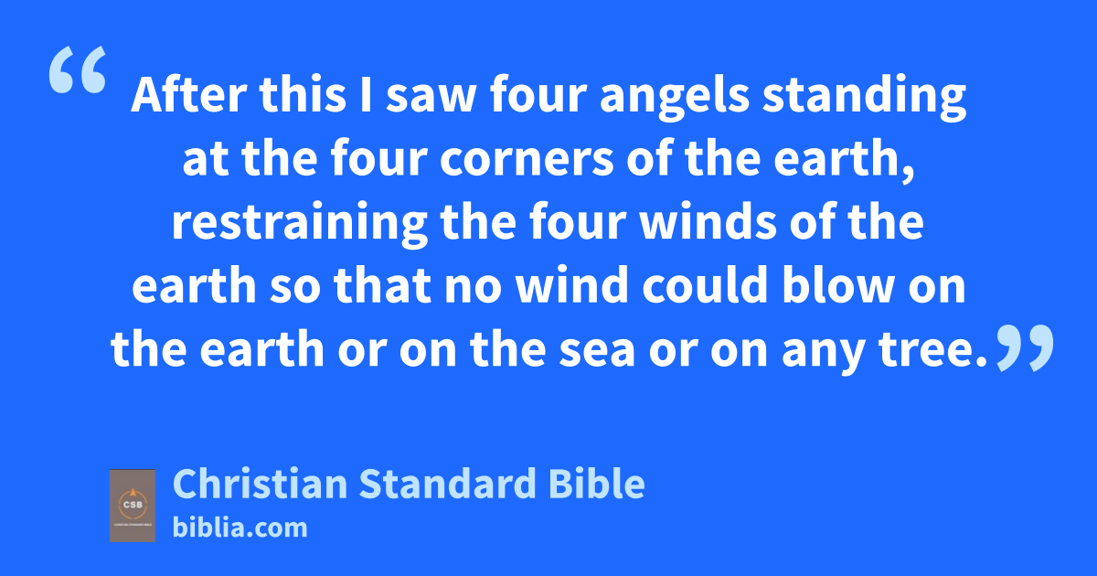 7 After this I saw four angelst standing at the four corners of the earth, restraining the four winds of the earthu so that no wind could blow on the earth or on the sea or on any tree. 2 Then I saw another angel rising up from the east,v who had the seal of the living God.w He cried out in a loud voice to the four angels who were allowed to harm the earth and the sea, 3 “Don’t harm the earth or the sea or the treesx until we seal the servants of our God on their foreheads.”y 4 And I heard the number of the sealed: