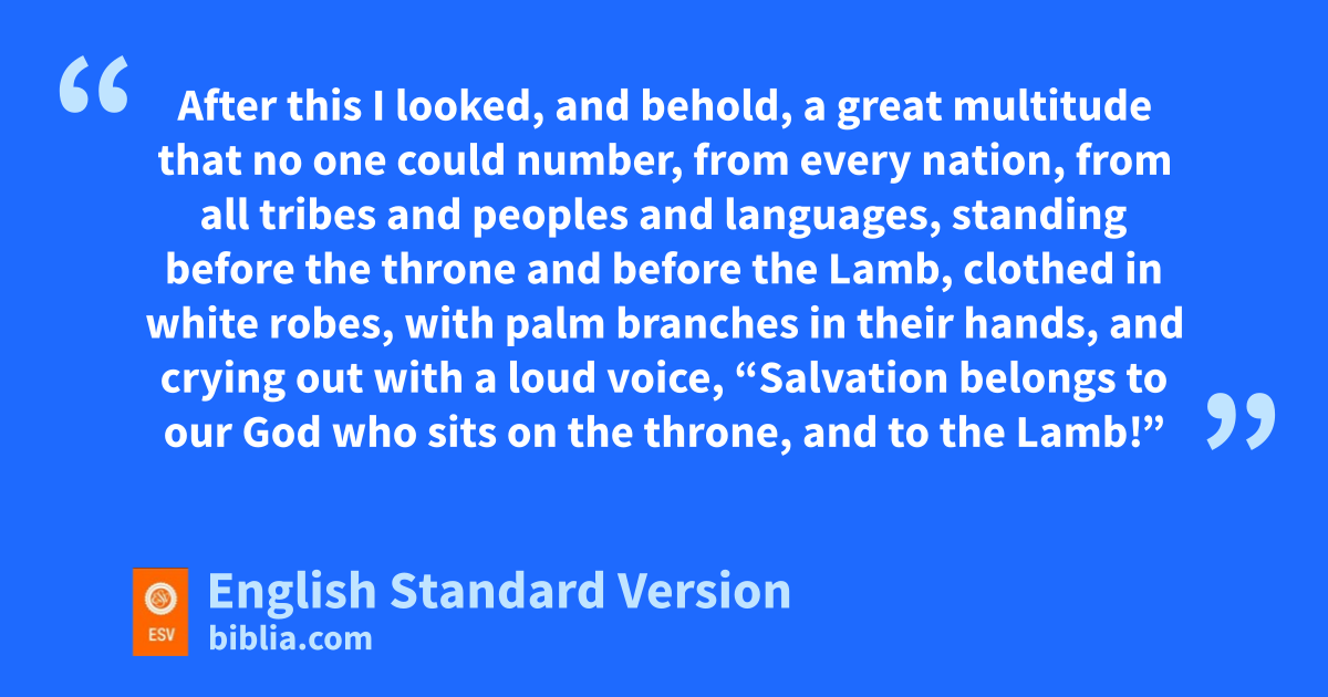 9 After this I looked, and behold, ba great multitude that no one could number, cfrom every nation, from all tribes and peoples and languages, standing before the throne and before the Lamb, dclothed in white robes, with epalm branches in their hands, 10 and crying out with a loud voice, f“Salvation belongs to our God who sits on the throne, and to the Lamb!” 11 And all the angels were standing around the throne and around the elders and gthe four living creatures, and they hfell on their faces before the throne and worshiped God, 12 isaying, “Amen! Blessing and glory and wisdom and thanksgiving and honor and power and might be to our God forever and ever! Amen.”