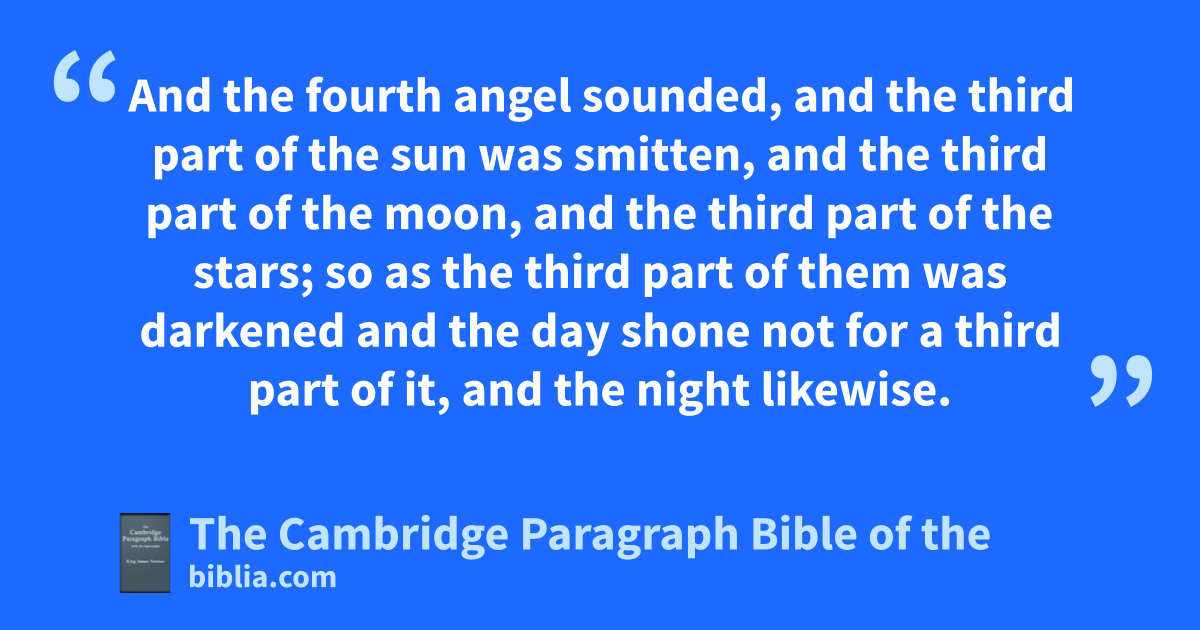 12 And the fourth angel sounded, and the third part of cthe sun was smitten, and the third part of the moon, and the third part of the stars; so as the third part of them was darkened and the day shone not for a third part of it, and the night likewise. 13 And I beheld, and heard dan angel deflying through the midst of heaven, saying with a loud voice, fWoe, woe, gwoe, to ghthe inhabiters of the earth by reason of the other voices of the trumpet of the three angels, which are yet to sound.