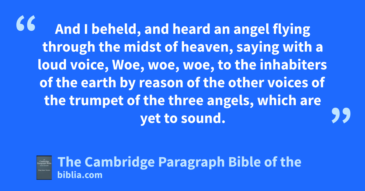 12 And the fourth angel sounded, and the third part of cthe sun was smitten, and the third part of the moon, and the third part of the stars; so as the third part of them was darkened and the day shone not for a third part of it, and the night likewise. 13 And I beheld, and heard dan angel deflying through the midst of heaven, saying with a loud voice, fWoe, woe, gwoe, to ghthe inhabiters of the earth by reason of the other voices of the trumpet of the three angels, which are yet to sound.