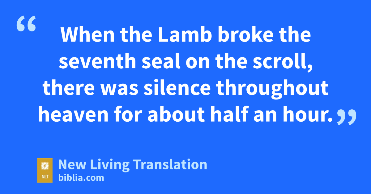 When the Lamb broke the seventh seal on the scroll,* there was silence throughout heaven for about half an hour. 2 I saw the seven angels who stand before God, and they were given seven trumpets.