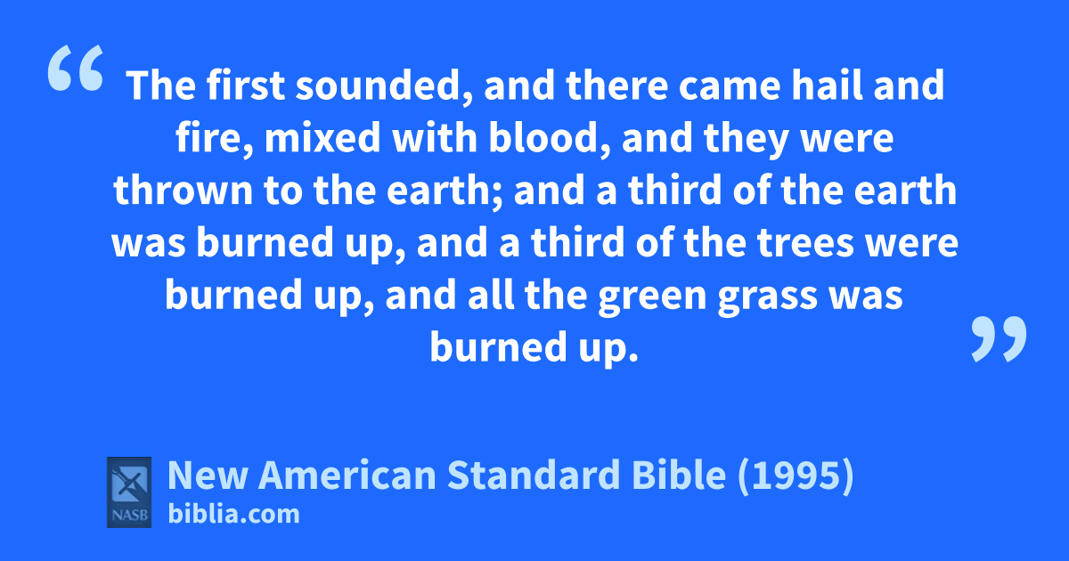 7 The first sounded, and there came ahail and fire, mixed with blood, and they were thrown to the earth; and ba third of the earth was burned up, and ba third of the ctrees were burned up, and all the green cgrass was burned up.