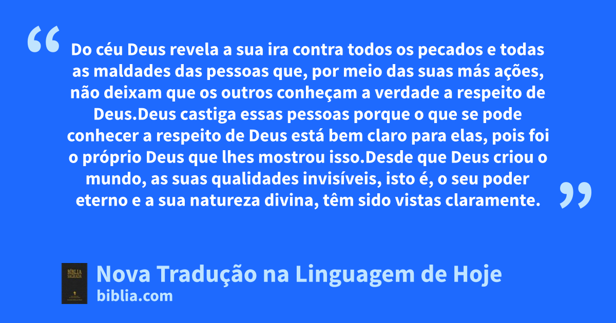 18 Do céu Deus revela a sua * ira contra todos os pecados e todas as maldades das pessoas que, por meio das suas más ações, não deixam que os outros conheçam a verdade a respeito de Deus.19 Deus castiga essas pessoas porque o que se pode conhecer a respeito de Deus está bem claro para elas, pois foi o próprio Deus que lhes mostrou isso.20 Desde que Deus criou o mundo, as suas qualidades invisíveis, isto é, o seu poder eterno e a sua natureza divina, têm sido vistas claramente. Os seres humanos podem ver tudo isso nas coisas que Deus tem feito e, portanto, eles não têm desculpa nenhuma.21 Eles sabem quem Deus é, mas não lhe dão a * glória que ele merece e não lhe são agradecidos. Pelo contrário, os seus pensamentos se tornaram tolos, e a sua mente vazia está coberta de escuridão.422 Eles dizem que são sábios, mas são tolos.23 Em vez de adorarem ao Deus * imortal, adoram ídolos que se parecem com seres humanos, ou com pássaros, ou com animais de quatro patas, ou com animais que se arrastam pelo chão.5