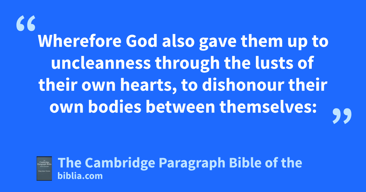18 For mthe wrath of God is revealed from heaven against all ungodliness and unrighteousness of men, who hold the truth in unrighteousness; 19 nbecause othat which may be known of God is manifest * in them; for God hath shewed it unto them. 20 For othe invisible things of him from the creation of the world are clearly seen, pbeing understood by the things that are made, even his eternal power and Godhead; * so that they are qwithout excuse: 21 because that, when they knew God, they glorified him not as God, neither were thankful; but rbecame svain in their imaginations, and their tfoolish heart swas darkened. 22 uProfessing themselves to be wise, they became fools, 23 and vchanged the glory of the uncorruptible God into wan image made like to corruptible man, and to birds, and wfourfooted beasts, and creeping things. 24 Wherefore xGod also gave them up to uncleanness through the lusts of their own hearts, yto dishonour their own bodies between themselves: 25 who changed zthe truth of God into aa lie, and worshipped and served the creature * more than the Creator, who is bblessed for ever. Amen.