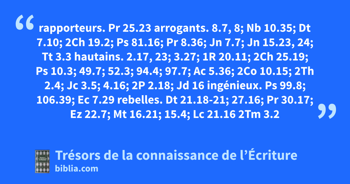 rapporteurs. Pr 25.23 arrogants. 8.7, 8; Nb 10.35; Dt 7.10; 2Ch 19.2; Ps 81.16; Pr 8.36; Jn 7.7; Jn 15.23, 24; Tt 3.3 hautains. 2.17, 23; 3.27; 1R 20.11; 2Ch 25.19; Ps 10.3; 49.7; 52.3; 94.4; 97.7; Ac 5.36; 2Co 10.15; 2Th 2.4; Jc 3.5; 4.16; 2P 2.18; Jd 16 ingénieux. Ps 99.8; 106.39; Ec 7.29 rebelles. Dt 21.18-21; 27.16; Pr 30.17; Ez 22.7; Mt 16.21; 15.4; Lc 21.16 2Tm 3.2