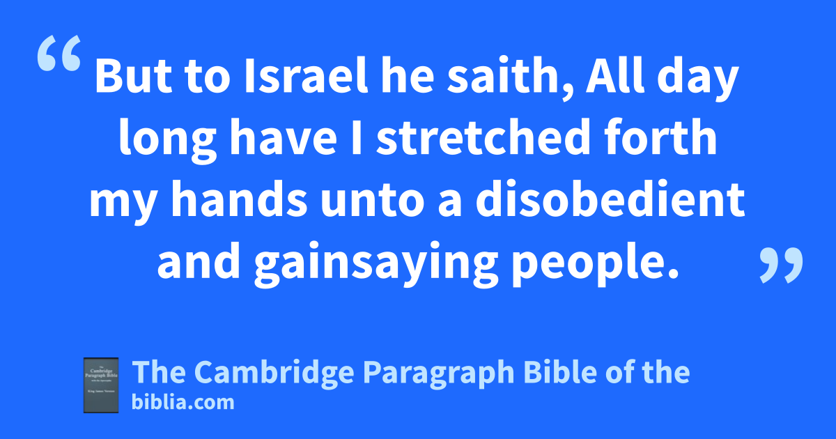 X. Brethren, amy heart’s desire and prayer to God for Israel is, that they might be saved. 2 For I bear them record bthat they have a zeal of God, but cnot according to knowledge. 3 For they being ignorant of dGod’s righteousness, and going about to establish dtheir own righteousness, have not submitted themselves unto the righteousness of God. 4 For eChrist is the end of the law for righteousness to every one that believeth. 5 For Moses describeth the righteousness which is of the law, That fthe man which doeth those things shall live by them. 6 But dthe righteousness which is of faith speaketh on this wise, gSay not in thine heart, Who shall ascend into heaven? (that is, hto bring Christ down from above:) 7 or, Who shall descend into the deep? (that is, to bring up Christ again from the dead.) 8 But what saith it? iThe word is nigh thee, even in thy mouth, and in thy heart: that is, the word of faith, which we preach; 9 that if thou shalt kconfess with thy mouth the Lord Jesus, and shalt lbelieve in thine heart that God hath raised him from the dead, thou shalt be saved. 10 For with the heart man believeth unto righteousness; and with the mouth confession is made unto salvation. 11 For llthe scripture saith, mWhosoever believeth on him shall not be ashamed. 12 For nthere is no difference between the Jew and the Greek: for othe same Lord over all is prich unto all that call upon him. 13 For qwhosoever shall rcall upon the name of the Lord shall be saved. 14 How then shall they call on him in whom they have not believed? and how shall they believe in him of whom they have not heard? and how shall they hear swithout a preacher? 15 And how shall they preach, except tthey be sent? as it is written, uHow beautiful are the feet of them that preach the gospel of peace, and bring glad tidings of good things! 16 But xthey have not all obeyed the gospel. For Esaias saith, Lord, ywho hath believed * our * zreport? 17 So then faith cometh by zhearing, and zhearing by the word of God. 18 But I say, Have they not heard? aYes verily, btheir sound went into all the earth, and their words unto the ends of the world. 19 But I say, Did not Israel know? First Moses saith, cI will provoke you to jealousy by them that are no people, and by a dfoolish nation I will anger you. 20 But Esaias is very bold, and saith, eI was found of them that sought me not; I was made manifest unto them that asked not after me. 21 But to Israel he saith, fAll day long have I stretched forth my hands unto a disobedient and gainsaying people.