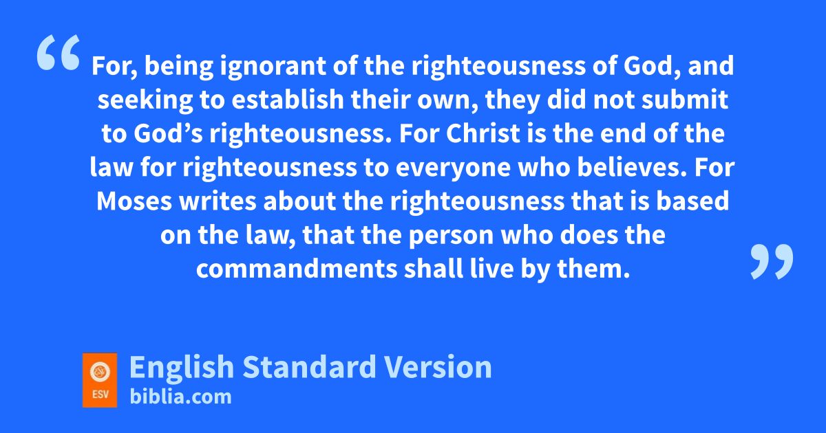 10 Brothers,1 my heart’s desire and prayer to God for them is that they may be saved. 2 For I bear them witness that bthey have a zeal for God, cbut not according to knowledge. 3 For, being ignorant of dthe righteousness of God, and seeking to establish their own, they did not submit to God’s righteousness. 4 For eChrist is the end of the law for righteousness to everyone who believes.2