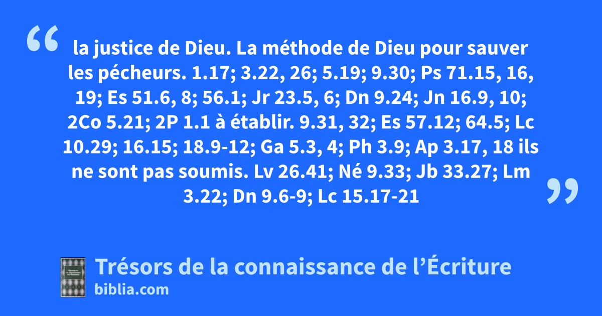 la justice de Dieu. La méthode de Dieu pour sauver les pécheurs. 1.17; 3.22, 26; 5.19; 9.30; Ps 71.15, 16, 19; Es 51.6, 8; 56.1; Jr 23.5, 6; Dn 9.24; Jn 16.9, 10; 2Co 5.21; 2P 1.1 à établir. 9.31, 32; Es 57.12; 64.5; Lc 10.29; 16.15; 18.9-12; Ga 5.3, 4; Ph 3.9; Ap 3.17, 18 ils ne sont pas soumis. Lv 26.41; Né 9.33; Jb 33.27; Lm 3.22; Dn 9.6-9; Lc 15.17-21