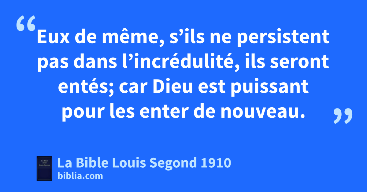 11Je dis donc: Est-ce pour tomber qu’ils ont bronché? Loin de là! Mais, par leur chute, le salut est devenu accessible aux païens, afin qu’ils fussent excités à la jalousie. 12Or, si leur chute a été la richesse du monde, et leur amoindrissement la richesse des païens, combien plus en sera-t-il ainsi quand ils se convertiront tous. 13Je vous le dis à vous, païens: ken tant que je suis apôtre des païens, je glorifie mon ministère, 14afin, s’il est possible, d’exciter la jalousie de ceux de ma race, et d’en sauver quelques-uns. 15Car si leur rejet a été la réconciliation du monde, que sera leur réintégration, sinon une vie d’entre les morts? 16Or, si les prémices sont saintes, la masse l’est aussi; et si la racine est sainte, les branches le sont aussi. 17Mais si quelques-unes des branches ont été retranchées, et si toi, qui étais un olivier sauvage, tu as été enté à leur place, et rendu participant de la racine et de la graisse lde l’olivier, 18ne te glorifie pas aux dépens de ces branches. Si tu te glorifies, sache que ce n’est pas toi qui portes la racine, mais que c’est la racine qui te porte. 19Tu diras donc: Les branches ont été retranchées, afin que moi je fusse enté. 20Cela est vrai; elles ont été retranchées pour cause d’incrédulité, et toi, tu subsistes par la foi. Ne t’abandonne pas à l’orgueil, mais crains; 21car si Dieu n’a pas épargné les branches naturelles, il ne t’épargnera pas non plus. 22Considère donc la bonté et la sévérité de Dieu: sévérité envers ceux qui sont tombés, et bonté de Dieu envers toi, si tu demeures ferme dans cette bonté; autrement, tu seras aussi retranché. 23mEux de même, s’ils ne persistent pas dans l’incrédulité, ils seront entés; car Dieu est puissant pour les enter de nouveau. 24Si toi, tu as été coupé de l’olivier naturellement sauvage, et enté contrairement à ta nature sur l’olivier franc, à plus forte raison eux seront-ils entés selon leur nature sur leur propre olivier.