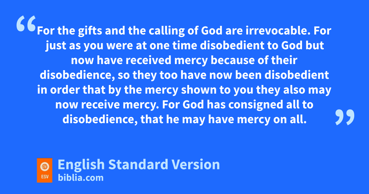 28 As regards the gospel, they are enemies for your sake. But as regards election, they are obeloved for the sake of their forefathers. 29 For the gifts and pthe calling of God are irrevocable. 30 For just as qyou were at one time disobedient to God but now have received mercy because of their disobedience, 31 so they too have now been disobedient in order that by the mercy shown to you they also may now5 receive mercy. 32 For God rhas consigned all to disobedience, that he may have mercy on all.