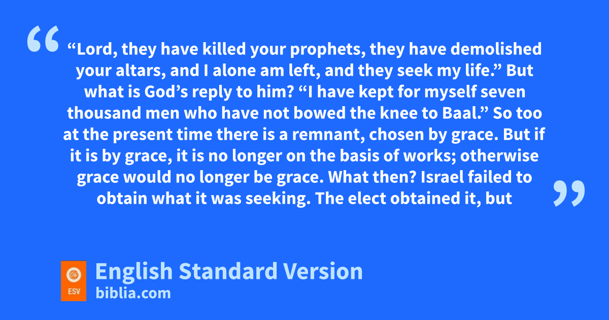 11 I ask, then, hhas God rejected his people? By no means! For iI myself am an Israelite, a descendant of Abraham,1 a member of the tribe of Benjamin. 2 jGod has not rejected his people whom he kforeknew. Do you not know what the Scripture says of Elijah, how he appeals to God against Israel? 3 l“Lord, they have killed your prophets, they have demolished your altars, and I alone am left, and they seek my life.” 4 But what is God’s reply to him? m“I have kept for myself seven thousand men who have not bowed the knee to Baal.” 5 So too at the present time there is na remnant, chosen by grace. 6 oBut if it is by grace, it is no longer on the basis of works; otherwise grace would no longer be grace.