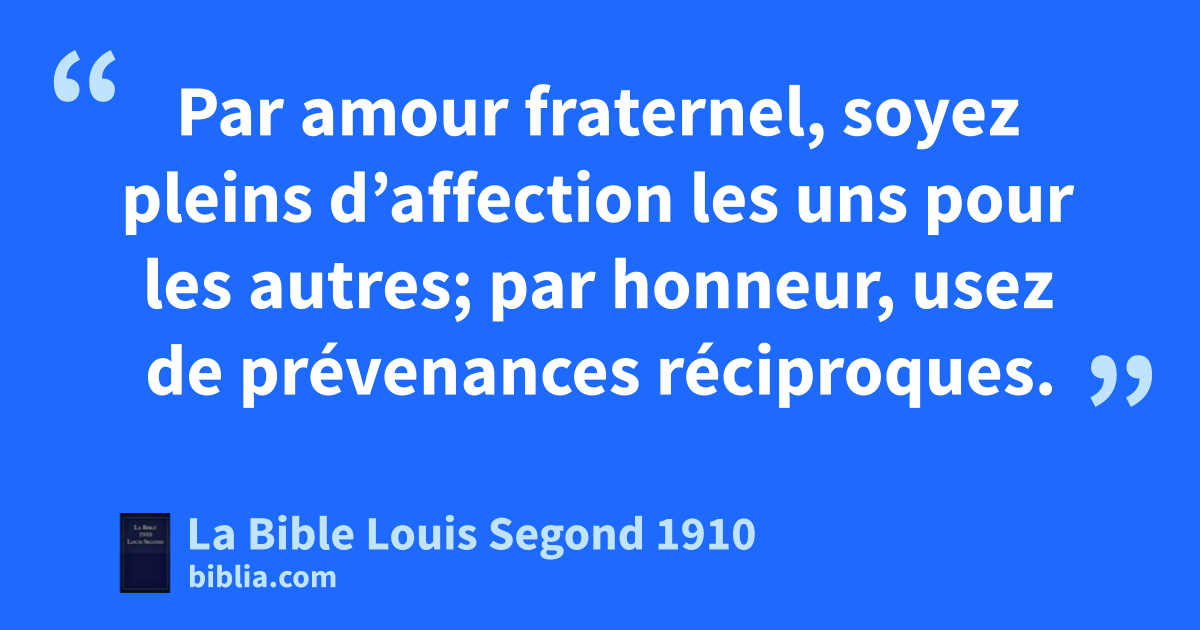 9Que la charité soit sans hypocrisie. oAyez le mal en horreur; attachez-vous fortement au bien. 10pPar amour fraternel, qsoyez pleins d’affection les uns pour les autres; par honneur, usez de prévenances réciproques. 11Ayez du zèle, et non de la paresse. Soyez fervents d’esprit. Servez le Seigneur. 12rRéjouissez-vous en espérance. sSoyez patients dans l’affliction. tPersévérez dans la prière. 13uPourvoyez aux besoins des saints. vExercez l’hospitalité. 14wBénissez ceux qui vous persécutent, bénissez et ne maudissez pas. 15Réjouissez-vous avec ceux qui se réjouissent; pleurez avec ceux qui pleurent. 16xAyez les mêmes sentiments les uns envers les autres. yN’aspirez pas à ce qui est élevé, mais laissez-vous attirer par ce qui est humble. Ne soyez point sages à vos propres yeux.