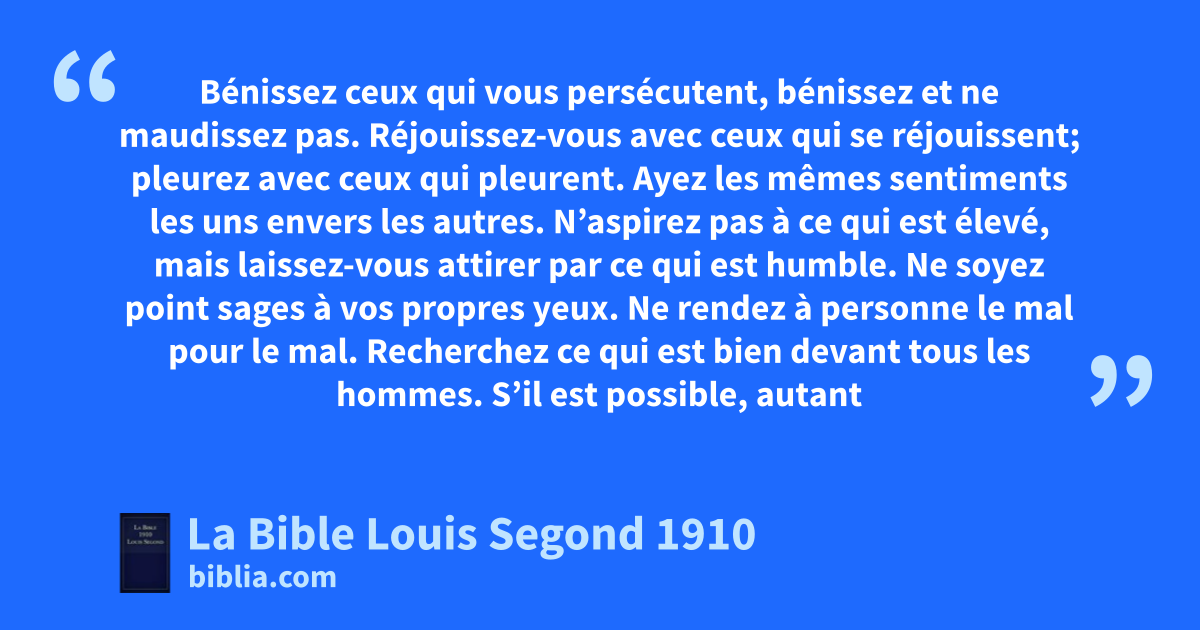 9Que la charité soit sans hypocrisie. oAyez le mal en horreur; attachez-vous fortement au bien. 10pPar amour fraternel, qsoyez pleins d’affection les uns pour les autres; par honneur, usez de prévenances réciproques. 11Ayez du zèle, et non de la paresse. Soyez fervents d’esprit. Servez le Seigneur. 12rRéjouissez-vous en espérance. sSoyez patients dans l’affliction. tPersévérez dans la prière. 13uPourvoyez aux besoins des saints. vExercez l’hospitalité. 14wBénissez ceux qui vous persécutent, bénissez et ne maudissez pas. 15Réjouissez-vous avec ceux qui se réjouissent; pleurez avec ceux qui pleurent. 16xAyez les mêmes sentiments les uns envers les autres. yN’aspirez pas à ce qui est élevé, mais laissez-vous attirer par ce qui est humble. Ne soyez point sages à vos propres yeux.
