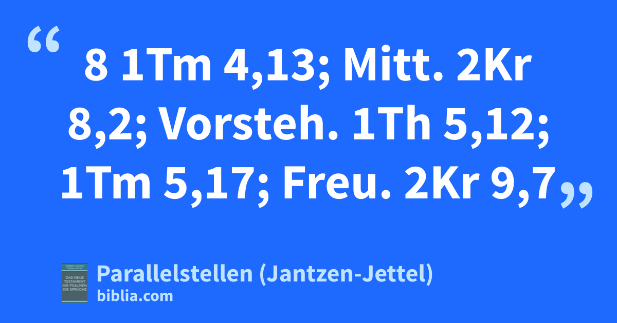 8 1Tm 4,13; Mitt. 2Kr 8,2; Vorsteh. 1Th 5,12; 1Tm 5,17; Freu. 2Kr 9,7