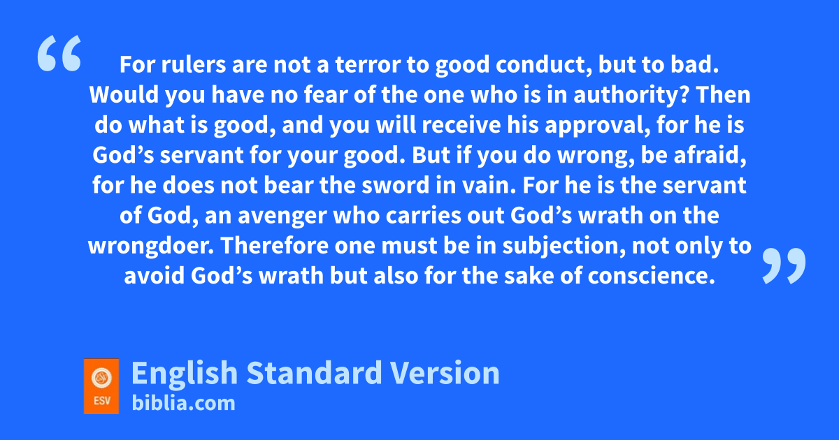 13 Let every person pbe subject to the governing authorities. For qthere is no authority except from God, and those that exist have been instituted by God. 2 Therefore whoever resists the authorities resists what God has appointed, and those who resist will incur judgment. 3 For rulers are not a terror to good conduct, but to bad. Would you have no fear of the one who is in authority? Then do what is good, and you rwill receive his approval, 4 for she is God’s servant for your good. But if you do wrong, be afraid, for he does not bear the sword in vain. For he is the servant of God, tan avenger who carries out God’s wrath on the wrongdoer. 5 Therefore one must be in subjection, not only to avoid God’s wrath but also ufor the sake of conscience. 6 For because of this you also pay taxes, for the authorities are ministers of God, attending to this very thing. 7 vPay to all what is owed to them: taxes to whom taxes are owed, revenue to whom revenue is owed, respect to whom respect is owed, honor to whom honor is owed.