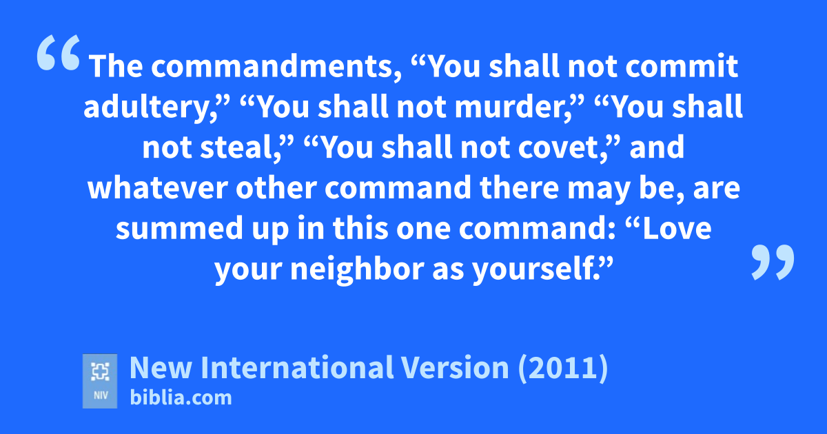8 Let no debt remain outstanding, except the continuing debt to love one another, for whoever loves others has fulfilled the law.x 9 The commandments, “You shall not commit adultery,” “You shall not murder,” “You shall not steal,” “You shall not covet,”a y and whatever other command there may be, are summed upz in this one command: “Love your neighbor as yourself.”b a 10 Love does no harm to a neighbor. Therefore love is the fulfillment of the law.b