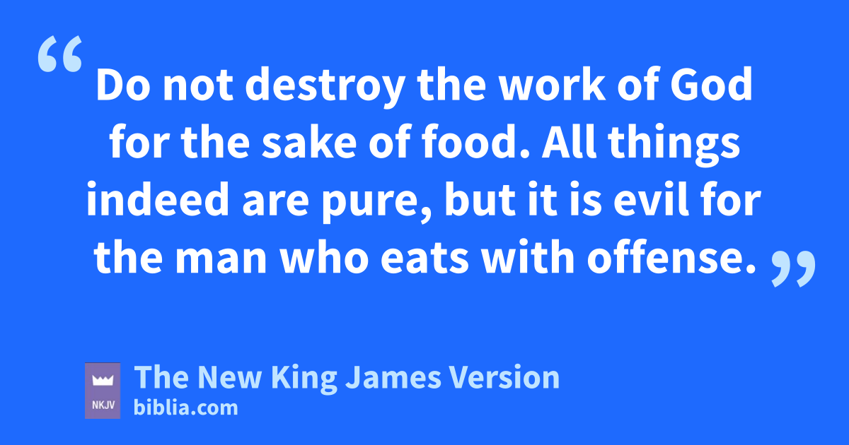 19 vTherefore let us pursue the things which make for peace and the things by which wone may 6edify another. 20 xDo not destroy the work of God for the sake of food. yAll things indeed are pure, zbut it is evil for the man who eats with 7offense. 21 It is good neither to eat ameat nor drink wine nor do anything by which your brother stumbles 8or is offended or is made weak. 22 9Do you have faith? Have it to yourself before God. bHappy is he who does not condemn himself in what he approves. 23 But he who doubts is condemned if he eats, because he does not eat from faith; for cwhatever is not from faith is 1sin.