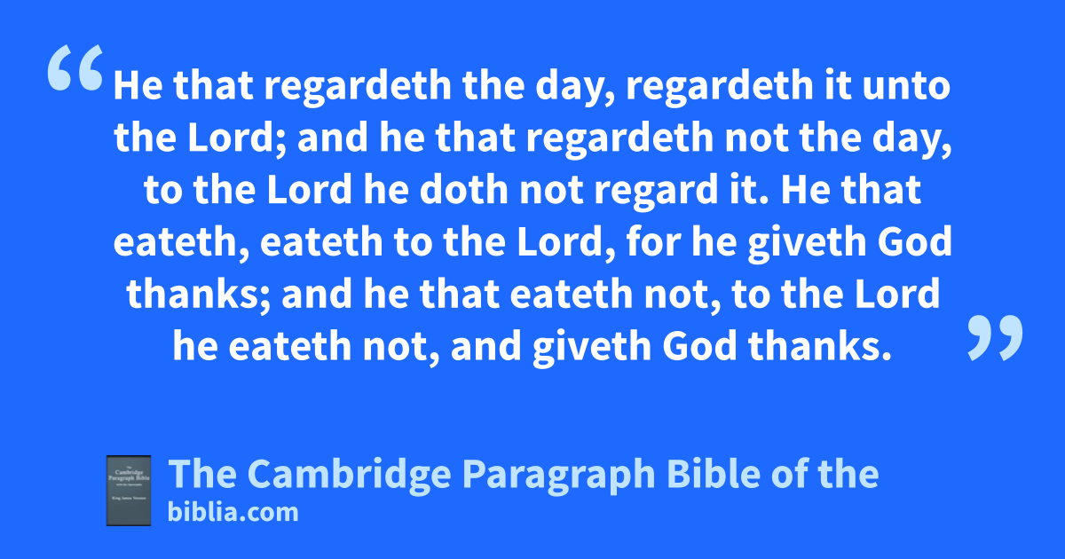 XIV. Him that is aweak in the faith breceive you, but * not to doubtful disputations. 2 For one believeth dthat he may eat all things: another, who is aweak, eateth herbs. 3 Let not him that eateth rdespise him that eateth not; and elet not him which eateth not judge him that eateth: for God hath breceived him. 4 fWho art thou that judgest another man’s gservant? to his own master he standeth or falleth. Yea, he shall be holden up: for God is able to make him stand. 5 hOne man esteemeth one day above another: another esteemeth every day alike. iLet every man be * kfully persuaded in his own mind. 6 He that * regardeth the day, regardeth it unto the Lord; and he that regardeth not the day, to the Lord he doth not regard it. He that eateth, eateth to the Lord, for lhe giveth God thanks; and he that eateth not, to the Lord he eateth not, and giveth God thanks. 7 For mnone of us liveth to himself, and no man dieth to himself. 8 For whether we live, we live unto the Lord; and whether we die, we die unto the Lord: whether we live therefore, or die, we are the Lord’s. 9 For mto this end Christ both ndied, and rose, and orevived, that he might be pLord both qof the dead and living.