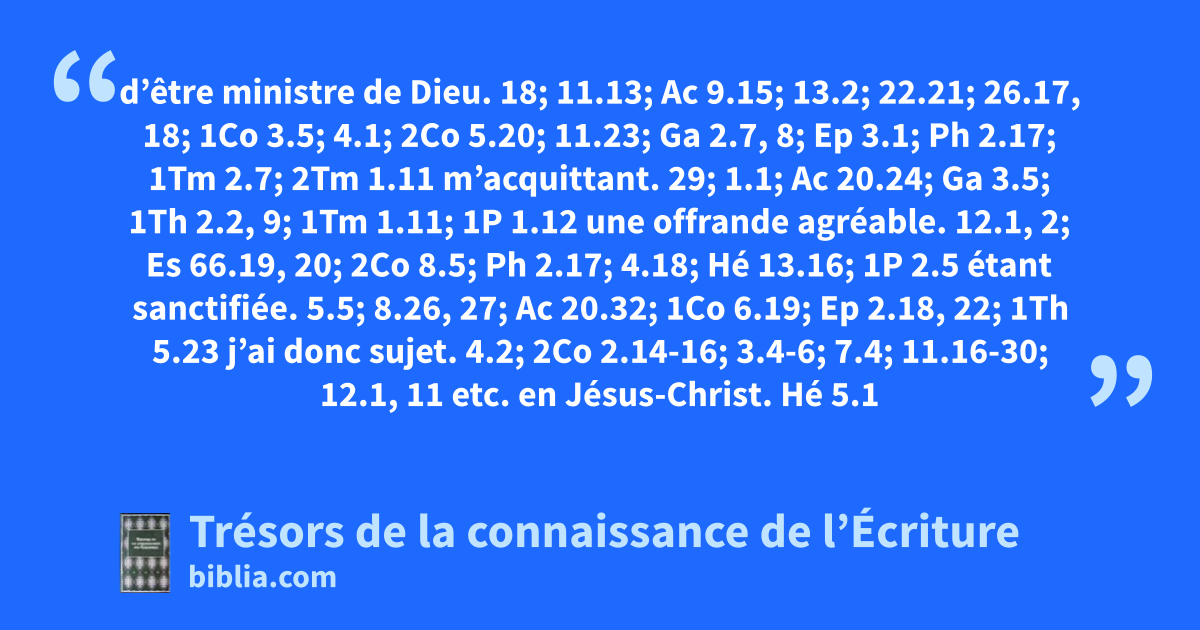 d’être ministre de Dieu. 18; 11.13; Ac 9.15; 13.2; 22.21; 26.17, 18; 1Co 3.5; 4.1; 2Co 5.20; 11.23; Ga 2.7, 8; Ep 3.1; Ph 2.17; 1Tm 2.7; 2Tm 1.11 m’acquittant. 29; 1.1; Ac 20.24; Ga 3.5; 1Th 2.2, 9; 1Tm 1.11; 1P 1.12 une offrande agréable. 12.1, 2; Es 66.19, 20; 2Co 8.5; Ph 2.17; 4.18; Hé 13.16; 1P 2.5 étant sanctifiée. 5.5; 8.26, 27; Ac 20.32; 1Co 6.19; Ep 2.18, 22; 1Th 5.23