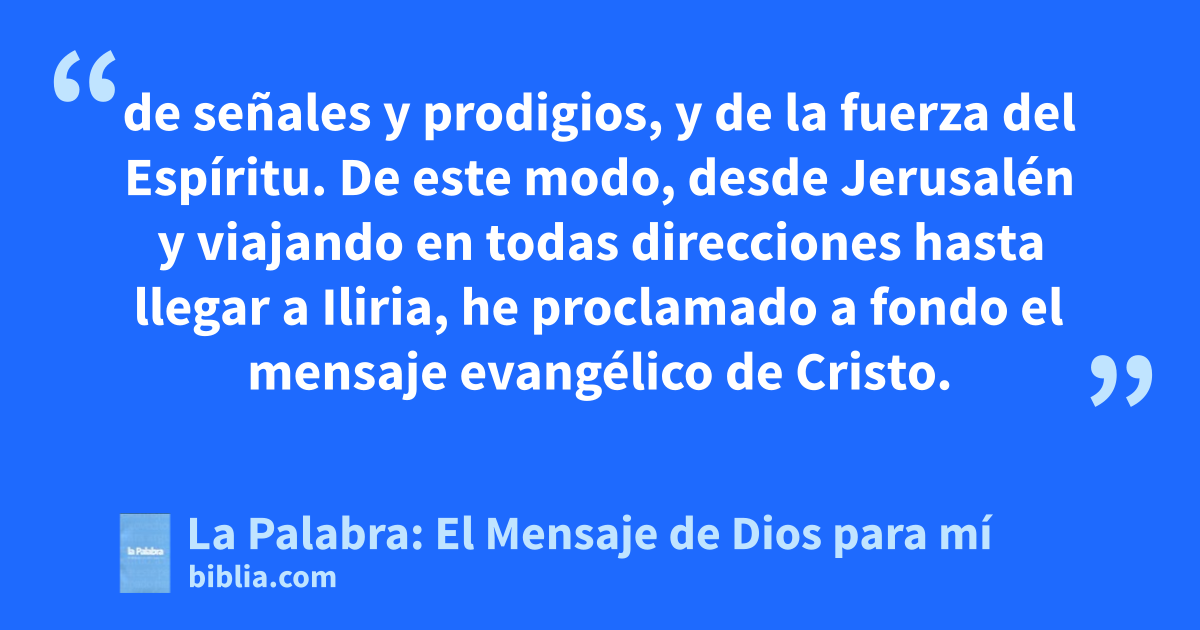 17 Tengo, pues, motivos para enorgullecerme como cristiano en lo que atañe al servicio de Dios. 18 Y eso hablando únicamente —a más no me atrevo— de lo que Cristo ha llevado a cabo sirviéndose de mí para hacer que los paganos respondan a la fe. Se ha valido para ello de palabras y acciones, 19 de señales y prodigios, y de la fuerza del Espíritu. De este modo, desde Jerusalén y viajando en todas direcciones hasta llegar a Iliria, he proclamado a fondo el mensaje evangélico de Cristo. 20 Eso sí, hice siempre cuestión de amor propio proclamar ese mensaje allí donde Cristo era aún desconocido; nunca quise edificar sobre cimiento ajeno, 21 para que se cumpla la Escritura: