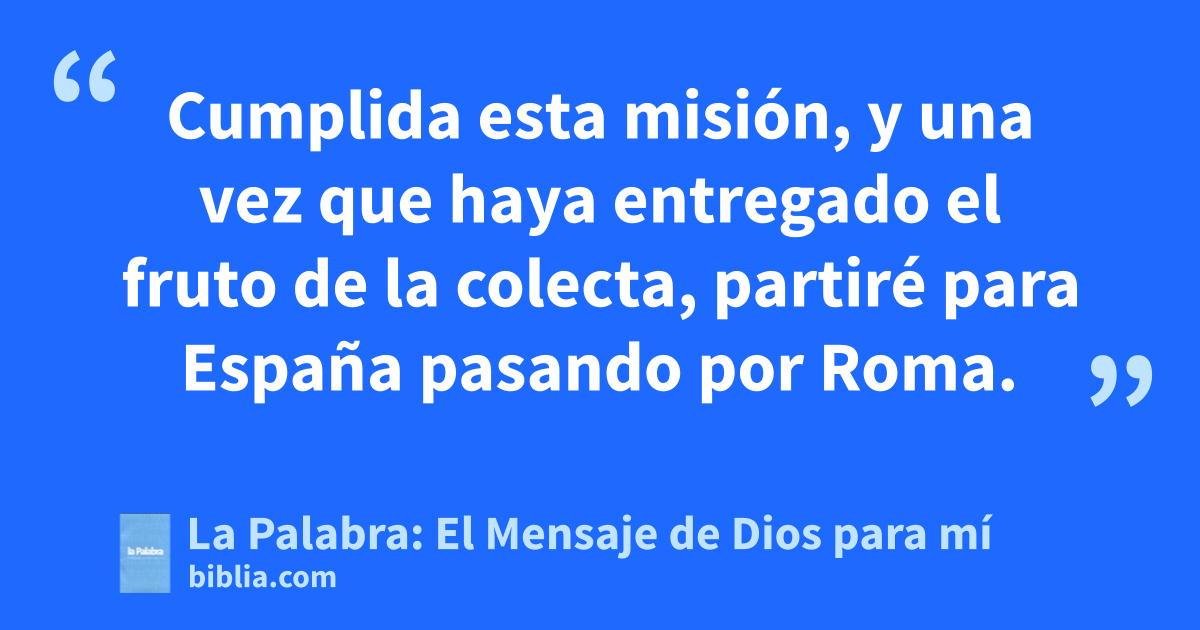 22 Ha sido precisamente esta tarea la que una y otra vez me ha impedido visitarlos. 23 Pero mi labor ha terminado ya en estos lugares, y como hace ya muchos años que deseo verlos, 24 confío en que, al fin, de paso para España, se logre mi deseo. Así lo espero, como también que me encaminen hacia allá después de haber disfrutado algún tiempo de la compañía de ustedes. 25 En este momento estoy a punto de emprender viaje a Jerusalén para prestar un servicio a aquellos hermanos en la fe. 26 Y es que los de Macedonia y Acaya han tenido a bien organizar una colecta en favor de los creyentes necesitados de Jerusalén. 27 Han tenido a bien, aunque en realidad es una obligación, ya que, si los paganos han participado en los bienes espirituales de los judíos, justo es que ahora los ayuden en lo material. 28 Cumplida esta misión, y una vez que haya entregado el fruto de la colecta, partiré para España pasando por Roma. 29 Estoy seguro de que la visita que pienso hacerles cuenta con la plena bendición de Cristo.