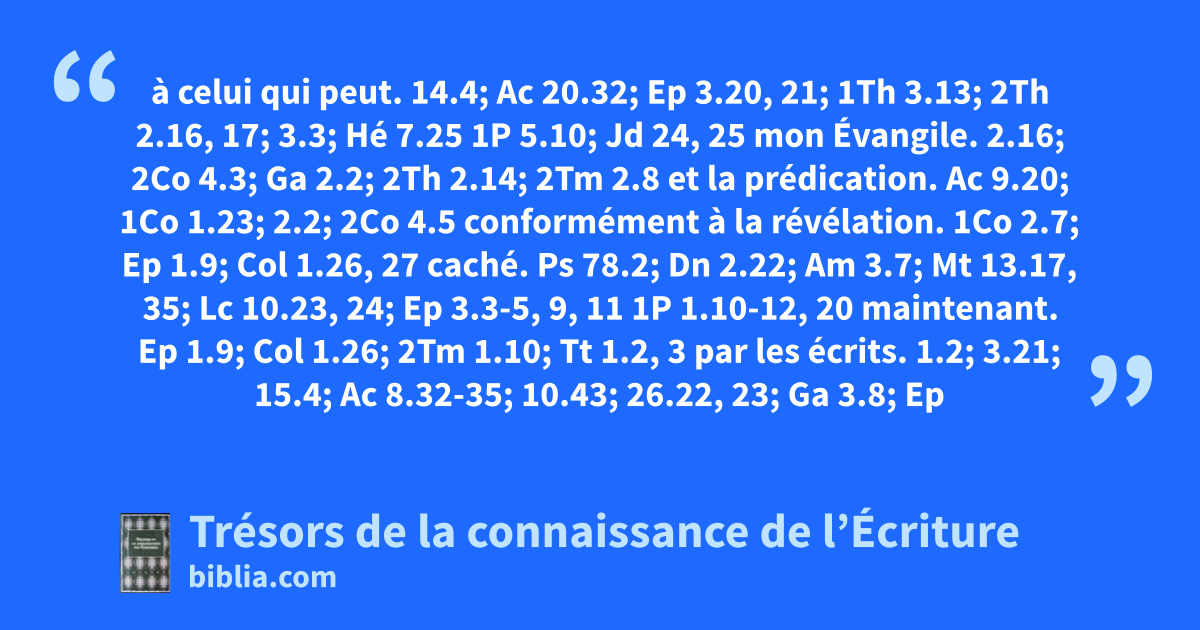 à celui qui peut. 14.4; Ac 20.32; Ep 3.20, 21; 1Th 3.13; 2Th 2.16, 17; 3.3; Hé 7.25 1P 5.10; Jd 24, 25 mon Évangile. 2.16; 2Co 4.3; Ga 2.2; 2Th 2.14; 2Tm 2.8 et la prédication. Ac 9.20; 1Co 1.23; 2.2; 2Co 4.5 conformément à la révélation. 1Co 2.7; Ep 1.9; Col 1.26, 27 caché. Ps 78.2; Dn 2.22; Am 3.7; Mt 13.17, 35; Lc 10.23, 24; Ep 3.3-5, 9, 11 1P 1.10-12, 20