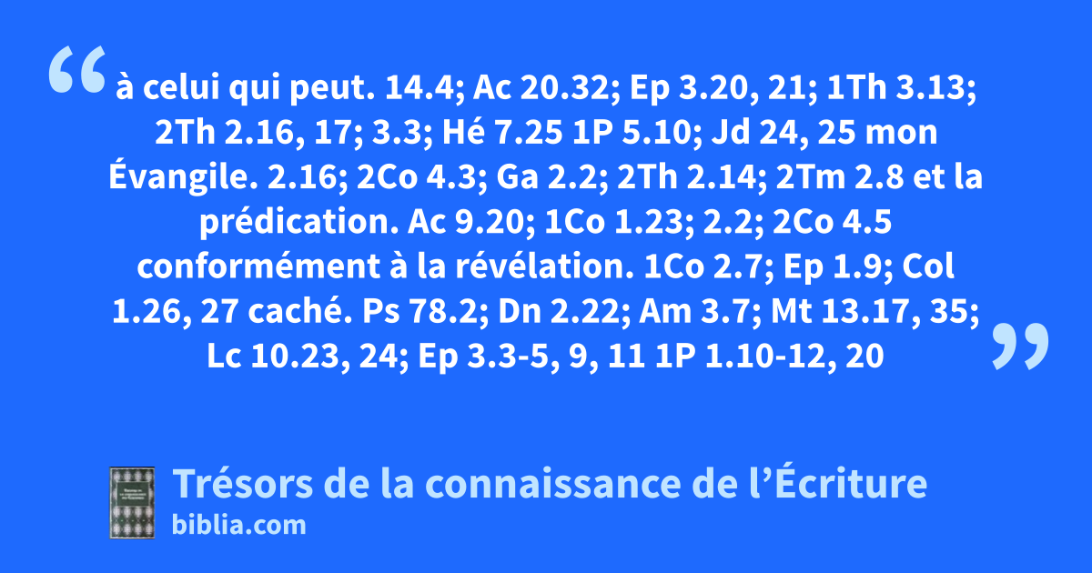 à celui qui peut. 14.4; Ac 20.32; Ep 3.20, 21; 1Th 3.13; 2Th 2.16, 17; 3.3; Hé 7.25 1P 5.10; Jd 24, 25 mon Évangile. 2.16; 2Co 4.3; Ga 2.2; 2Th 2.14; 2Tm 2.8 et la prédication. Ac 9.20; 1Co 1.23; 2.2; 2Co 4.5 conformément à la révélation. 1Co 2.7; Ep 1.9; Col 1.26, 27 caché. Ps 78.2; Dn 2.22; Am 3.7; Mt 13.17, 35; Lc 10.23, 24; Ep 3.3-5, 9, 11 1P 1.10-12, 20