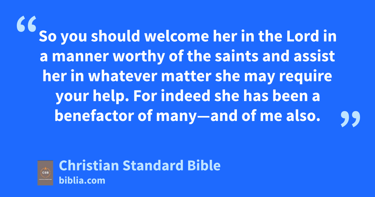 16 I commend to youap our sister Phoebe, who is a servantI of the church in Cenchreae.aq 2 So you should welcome her in the Lordar in a manner worthy of the saints and assist her in whatever matter she may require your help. For indeed she has been a benefactor of many—and of me also.