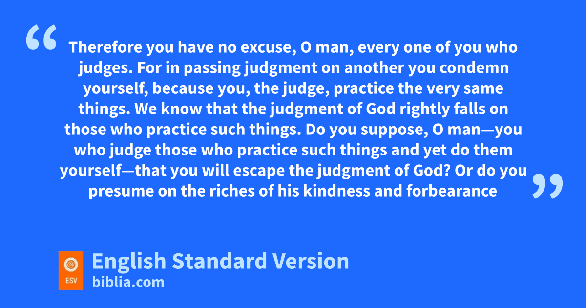 2 Therefore you have fno excuse, O man, every one of you who judges. For gin passing judgment on another you condemn yourself, because you, the judge, practice the very same things. 2 We know that the judgment of God rightly falls on those who practice such things. 3 Do you suppose, O man—you who judge those who practice such things and yet do them yourself—that you will escape the judgment of God? 4 Or do you presume on hthe riches of his kindness and iforbearance and jpatience, knot knowing that God’s kindness is meant to lead you to repentance? 5 But because of your hard and impenitent heart you are lstoring up mwrath for yourself on the day of wrath when God’s righteous judgment will be revealed.