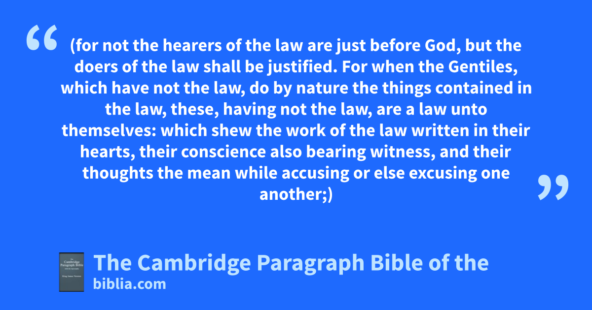 II. Therefore thou art ainexcusable, bO man, whosoever thou art that judgest: for cwherein thou judgest another, thou condemnest thyself; for thou that judgest doest the same things. 2 But dwe are sure that the judgment of God is according to truth against them which commit such things. 3 And thinkest thou this, bO man, that judgest them which do such things, and doest the same, that thou shalt escape the judgment of God? 4 Or despisest thou ethe riches of his goodness and fforbearance and glongsuffering; hnot knowing that the goodness of God leadeth thee to repentance? 5 But after thy hardness and impenitent heart itreasurest up unto thyself wrath against kthe day of wrath and revelation of the righteous judgment of God; 6 lwho will render to every man according to his deeds: 7 to them who by mpatient continuance in well doing seek for glory and honour and immortality, neternal life: 8 but unto them othat are contentious, and pdo not obey the truth, but obey unrighteousness, indignation and qwrath, 9 rtribulation and ranguish, supon every soul of man that doeth evil, tof the uJew first, and also of the * uGentile; 10 but wglory, whonour, and peace, to every man that worketh good, to the Jew first, and also to the * Gentile: 11 for there is xno respect of persons with God. 12 For uas many as have sinned without law shall also perish without law: and uas many as have sinned in the law shall be judged yby the law; 13 (for not zthe hearers of the law are just before God, but the doers of the law ashall be justified. 14 For when the Gentiles, which have not the law, do by nature the things contained in the law, these, having not the law, are a law unto themselves: 15 which shew the work of the law written in their hearts, * their conscience also bearing witness, and btheir thoughts * the mean while accusing or else excusing one another;) 16 cin the day when God shall judge the secrets of men dby Jesus Christ eaccording to my gospel.