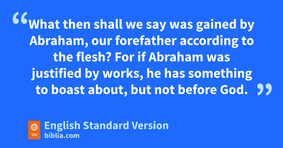 4 What then shall we say was gained by Abraham, tour forefather according to the flesh? 2 For if Abraham was justified by works, he has something to boast about, but unot before God. 3 For what does the Scripture say? v“Abraham believed God, and it was counted to him as righteousness.” 4 Now wto the one who works, his wages are not counted as a gift but as his due. 5 And to the one who does not work but xbelieves in2 him who justifies the ungodly, his faith is counted as righteousness, 6 just as David also speaks of the blessing of the one to whom God counts righteousness apart from works: