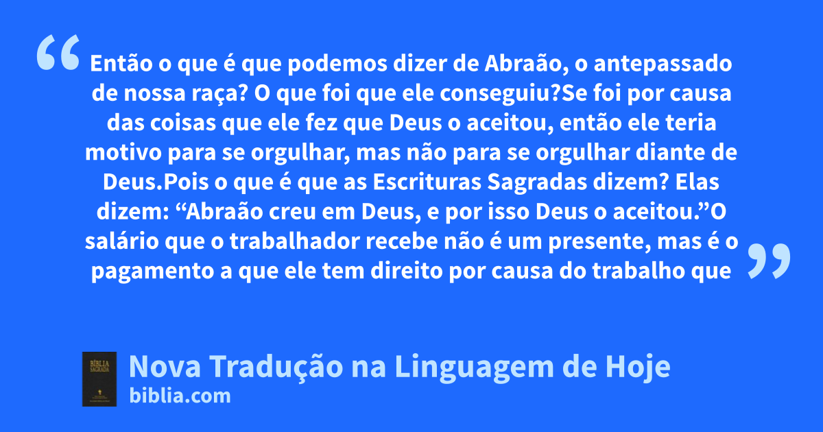 1 Então o que é que podemos dizer de Abraão, o antepassado de nossa raça? O que foi que ele conseguiu?2 Se foi por causa das coisas que ele fez que Deus o aceitou, então ele teria motivo para se orgulhar, mas não para se orgulhar diante de Deus.3 Pois o que é que as * Escrituras Sagradas dizem? Elas dizem: “Abraão creu em Deus, e por isso Deus o aceitou.”204 O salário que o trabalhador recebe não é um presente, mas é o pagamento a que ele tem direito por causa do trabalho que fez.5 Porém a pessoa que não põe a sua esperança nas coisas que faz, mas simplesmente crê em Deus, é a fé dessa pessoa que faz com que ela seja aceita por Deus, o Deus que trata o culpado como se ele fosse inocente.6 E isso foi o que Davi queria dizer quando falou da felicidade daqueles que Deus aceita, sem levar em conta o que eles fazem.7 Davi disse: