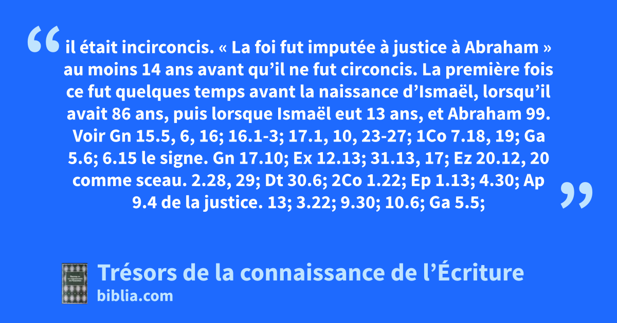 il était incirconcis. « La foi fut imputée à justice à Abraham » au moins 14 ans avant qu’il ne fut circoncis. La première fois ce fut quelques temps avant la naissance d’Ismaël, lorsqu’il avait 86 ans, puis lorsque Ismaël eut 13 ans, et Abraham 99. Voir Gn 15.5, 6, 16; 16.1-3; 17.1, 10, 23-27; 1Co 7.18, 19; Ga 5.6; 6.15