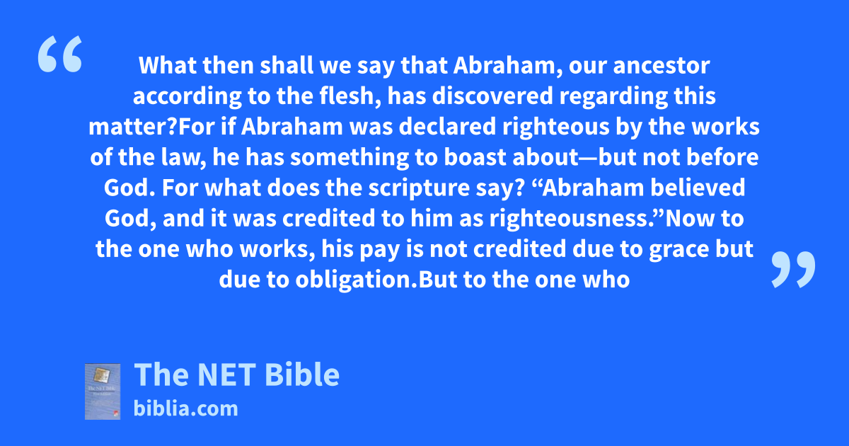 4:1 What then shall we say that Abraham, our ancestor according to the flesh,1 has discovered regarding this matter?2 4:2 For if Abraham was declared righteous3 by the works of the law, he has something to boast about—but not before God. 4:3 For what does the scripture say? “Abraham believed God, and it was credited4 to him as righteousness.”5 4:4 Now to the one who works, his pay is not credited due to grace but due to obligation.6 4:5 But to the one who does not work, but believes in the one who declares the ungodly righteous,7 his faith is credited as righteousness.
