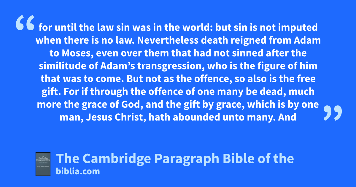12 Wherefore, as tby one man sin entered into the world, and udeath by sin; and so death passed upon zall men, * vfor that all have sinned: 13 for until the law sin was in the world: but wsin is not imputed when there is no law. 14 Nevertheless death reigned from Adam to Moses, even over them that had not sinned after the similitude of xAdam’s transgression, ywho is the figure of him that was to come. 15 But not as the offence, so also is the free gift. For if through the offence of one zmany be dead, much more athe grace of God, and the gift by grace, which is by one man, Jesus Christ, hath abounded unto zbmany. 16 And not as it was by one that sinned, so is the gift: for the judgment was by one to condemnation, but the free gift is of many offences unto cjustification. 17 For if * by one man’s offence death reigned by one; much more they which receive abundance of grace and of the gift of righteousness shall reign in life by one, Jesus Christ. 18 Therefore as * by dthe offence of one judgment came upon all men to condemnation; even so * by dthe crighteousness of one the free gift came upon zeall men unto fjustification of life. 19 For as by one man’s disobedience zmany were made sinners, so by the obedience of one shall bzmany be made righteous. 20 Moreover gthe law hentered, that the offence might abound. But iwhere sin abounded, jgrace did much more abound: 21 that as sin hath reigned unto death, even so might kgrace reign through righteousness unto leternal life by Jesus Christ our Lord.