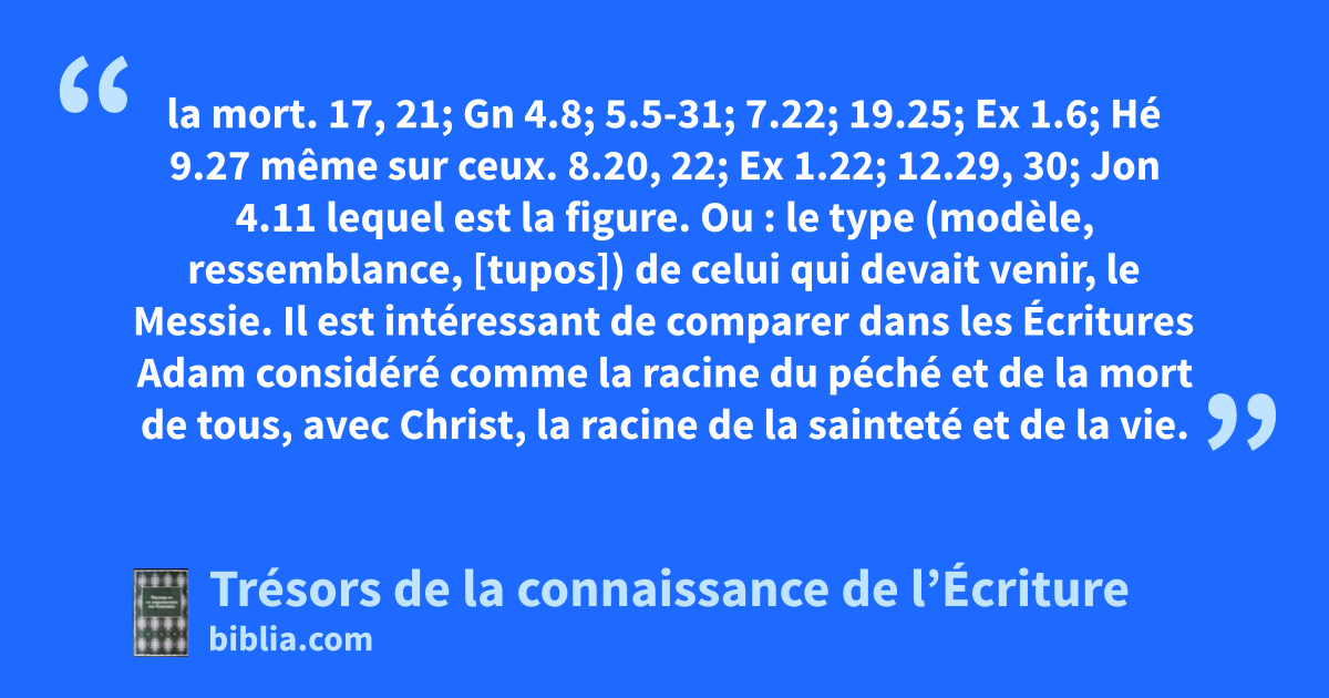 la mort. 17, 21; Gn 4.8; 5.5-31; 7.22; 19.25; Ex 1.6; Hé 9.27 même sur ceux. 8.20, 22; Ex 1.22; 12.29, 30; Jon 4.11 lequel est la figure. Ou : le type (modèle, ressemblance, [tupos]) de celui qui devait venir, le Messie. Il est intéressant de comparer dans les Écritures Adam considéré comme la racine du péché et de la mort de tous, avec Christ, la racine de la sainteté et de la vie.