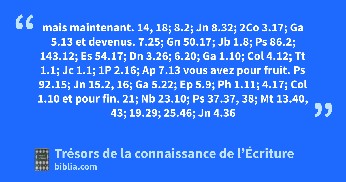 mais maintenant. 14, 18; 8.2; Jn 8.32; 2Co 3.17; Ga 5.13 et devenus. 7.25; Gn 50.17; Jb 1.8; Ps 86.2; 143.12; Es 54.17; Dn 3.26; 6.20; Ga 1.10; Col 4.12; Tt 1.1; Jc 1.1; 1P 2.16; Ap 7.13 vous avez pour fruit. Ps 92.15; Jn 15.2, 16; Ga 5.22; Ep 5.9; Ph 1.11; 4.17; Col 1.10 et pour fin. 21; Nb 23.10; Ps 37.37, 38; Mt 13.40, 43; 19.29; 25.46; Jn 4.36