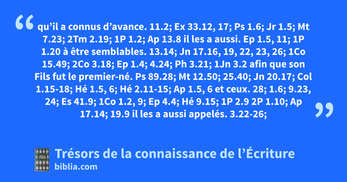 qu’il a connus d’avance. 11.2; Ex 33.12, 17; Ps 1.6; Jr 1.5; Mt 7.23; 2Tm 2.19; 1P 1.2; Ap 13.8 il les a aussi. Ep 1.5, 11; 1P 1.20 à être semblables. 13.14; Jn 17.16, 19, 22, 23, 26; 1Co 15.49; 2Co 3.18; Ep 1.4; 4.24; Ph 3.21; 1Jn 3.2 afin que son Fils fut le premier-né. Ps 89.28; Mt 12.50; 25.40; Jn 20.17; Col 1.15-18; Hé 1.5, 6; Hé 2.11-15; Ap 1.5, 6