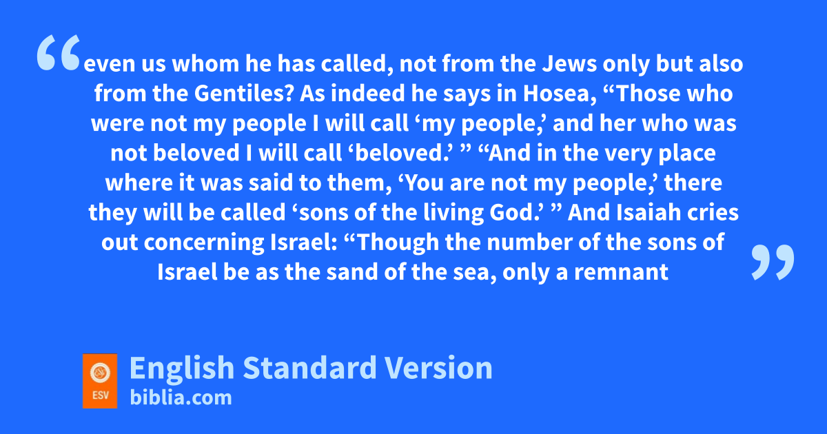 6 But it is not as though the word of God has failed. For not all who are descended from Israel belong to Israel, 7 and not all are children of Abraham obecause they are his offspring, but p“Through Isaac shall your offspring be named.” 8 This means that it is not the children of the flesh who are the children of God, but qthe children of the promise are counted as offspring. 9 For this is what the promise said: r“About this time next year I will return, and Sarah shall have a son.” 10 And not only so, but salso when Rebekah had conceived children by one man, our forefather Isaac, 11 though they were not yet born and had done nothing either good or bad—in order that God’s purpose of election might continue, not because of works but because of thim who calls— 12 she was told, u“The older will serve the younger.” 13 As it is written, v“Jacob I loved, but Esau I hated.”