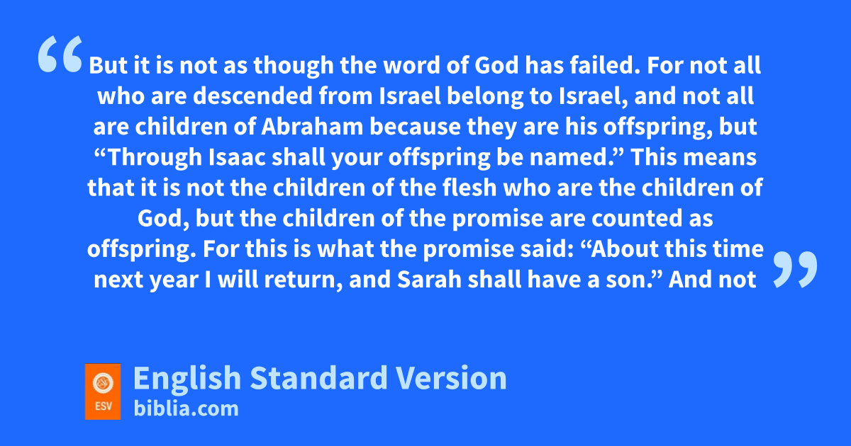 6 But it is not as though the word of God has failed. For not all who are descended from Israel belong to Israel, 7 and not all are children of Abraham obecause they are his offspring, but p“Through Isaac shall your offspring be named.” 8 This means that it is not the children of the flesh who are the children of God, but qthe children of the promise are counted as offspring. 9 For this is what the promise said: r“About this time next year I will return, and Sarah shall have a son.” 10 And not only so, but salso when Rebekah had conceived children by one man, our forefather Isaac, 11 though they were not yet born and had done nothing either good or bad—in order that God’s purpose of election might continue, not because of works but because of thim who calls— 12 she was told, u“The older will serve the younger.” 13 As it is written, v“Jacob I loved, but Esau I hated.”