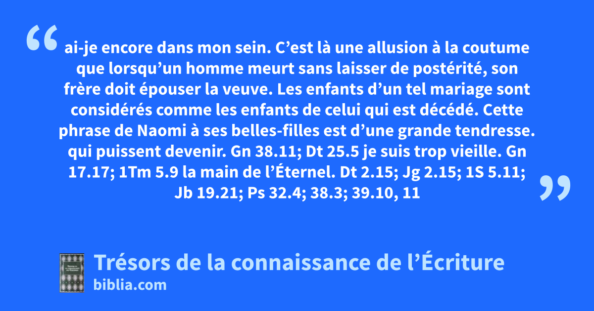 ai-je encore dans mon sein. C’est là une allusion à la coutume que lorsqu’un homme meurt sans laisser de postérité, son frère doit épouser la veuve. Les enfants d’un tel mariage sont considérés comme les enfants de celui qui est décédé. Cette phrase de Naomi à ses belles-filles est d’une grande tendresse. qui puissent devenir. Gn 38.11; Dt 25.5