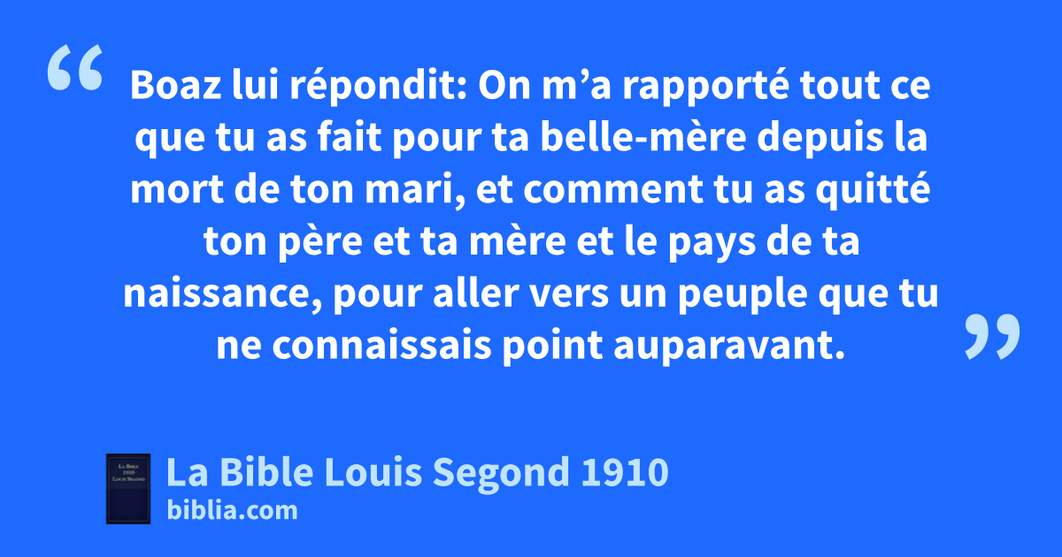 1Naomi avait un parent de son mari. C’était un homme puissant et riche, de la famille d’Élimélec, et qui se nommait aBoaz. 2Ruth la Moabite dit à Naomi: Laisse-moi, je te prie, aller glaner des épis dans le champ de celui aux yeux duquel je trouverai grâce. Elle lui répondit: Va, ma fille. 3Elle alla glaner dans un champ, derrière les moissonneurs. Et il se trouva par hasard que la pièce de terre appartenait à Boaz, qui était de la famille d’Élimélec. 4Et voici, Boaz vint de Bethléhem, et il dit aux moissonneurs: Que l’Éternel soit avec vous! Ils lui répondirent: Que l’Éternel te bénisse! 5Et Boaz dit à son serviteur chargé de surveiller les moissonneurs: A qui est cette jeune femme? 6Le serviteur chargé de surveiller les moissonneurs répondit: C’est une jeune femme Moabite, qui est revenue avec Naomi du pays de Moab. 7Elle a dit: Permettez-moi de glaner et de ramasser des épis entre les gerbes, derrière les moissonneurs. Et depuis ce matin qu’elle est venue, elle a été debout jusqu’à présent, et ne s’est reposée qu’un moment dans la maison. 8Boaz dit à Ruth: Écoute, ma fille, ne va pas glaner dans un autre champ; ne t’éloigne pas d’ici, et reste avec mes servantes. 9Regarde où l’on moissonne dans le champ, et va après elles. J’ai défendu à mes serviteurs de te toucher. Et quand tu auras soif, tu iras aux vases, et tu boiras de ce que les serviteurs auront puisé. 10Alors elle tomba sur sa face et se prosterna contre terre, et elle lui dit: Comment ai-je trouvé grâce à tes yeux, pour que tu t’intéresses à moi, à moi qui suis une étrangère? 11Boaz lui répondit: On m’a rapporté tout ce que tu as fait pour ta belle-mère depuis la mort de ton mari, et comment tu as quitté ton père et ta mère et le pays de ta naissance, pour aller vers un peuple que tu ne connaissais point auparavant. 12Que l’Éternel te rende ce que tu as fait, et que ta récompense soit entière de la part de l’Éternel, le Dieu d’Israël, sous les ailes duquel tu es venue te réfugier! 13Et elle dit: Oh! que je trouve grâce à tes yeux, mon seigneur! Car tu m’as consolée, et tu as parlé au coeur de ta servante. Et pourtant je ne suis pas, moi, comme l’une de tes servantes. 14Au moment du repas, Boaz dit à Ruth: Approche, mange du pain, et trempe ton morceau dans le vinaigre. Elle s’assit à côté des moissonneurs. On lui donna du grain rôti; elle mangea et se rassasia, et elle garda le reste. 15Puis elle se leva pour glaner. Boaz donna cet ordre à ses serviteurs: Qu’elle glane aussi entre les gerbes, et ne l’inquiétez pas, 16et même vous ôterez pour elle des gerbes quelques épis, que vous la laisserez glaner, sans lui faire de reproches. 17Elle glana dans le champ jusqu’au soir, et elle battit ce qu’elle avait glané. Il y eut environ un épha d’orge. 18Elle l’emporta et rentra dans la ville, et sa belle-mère vit ce qu’elle avait glané. Elle sortit aussi les restes de son repas, et les lui donna. 19Sa belle-mère lui dit: Où as-tu glané aujourd’hui, et où as-tu travaillé? Béni soit celui qui s’est intéressé à toi! Et Ruth fit connaître à sa belle-mère chez qui elle avait travaillé: L’homme chez qui j’ai travaillé aujourd’hui, dit-elle, s’appelle Boaz. 20Naomi dit à sa belle-fille: Qu’il soit béni de l’Éternel, qui se montre miséricordieux pour les vivants comme il le fut pour ceux qui sont morts! Cet homme est notre parent, lui dit encore Naomi, il est de ceux qui ont sur nous droit de rachat. 21Ruth la Moabite ajouta: Il m’a dit aussi: Reste avec mes serviteurs, jusqu’à ce qu’ils aient achevé toute ma moisson. 22Et Naomi dit à Ruth, sa belle-fille: Il est bon, ma fille, que tu sortes avec ses servantes, et qu’on ne te rencontre pas dans un autre champ. 23Elle resta donc avec les servantes de Boaz, pour glaner, jusqu’à la fin de la moisson des orges et de la moisson du froment. Et elle demeurait avec sa belle-mère.