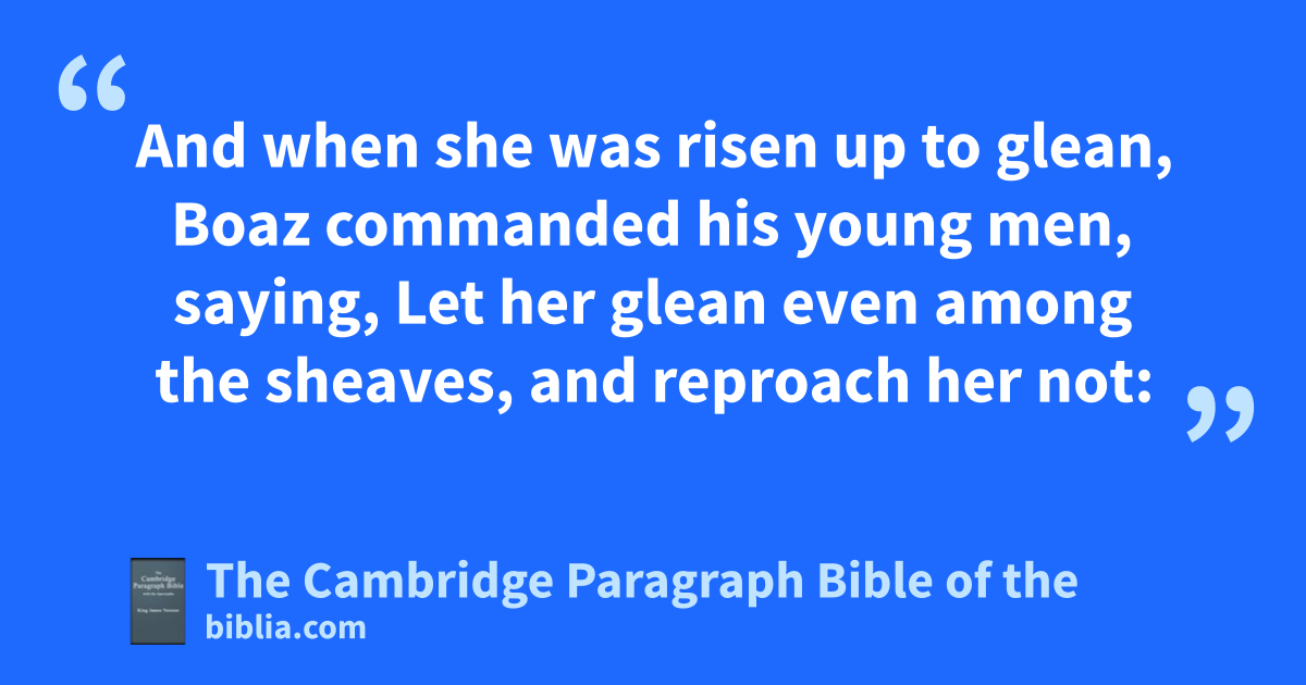 8 Then said Boaz unto Ruth, Hearest thou not, my daughter? Go not to glean in another field, neither go from hence, but abide here fast by my maidens: 9 let thine eyes be on the field that they do reap, and go thou after them: have I not charged the young men that they shall not touch thee? and when thou art athirst, go unto the vessels, and drink of that which the young men have drawn. 10 Then she ffell on her face, and bowed herself to the ground, and said unto him, Why have I found grace in thine eyes, that thou shouldest take knowledge of me, seeing I am a stranger? 11 And Boaz answered and said unto her, It hath fully been shewed me, gall that thou hast done unto thy mother in law since the death of thine husband: and how thou hast left thy father and thy mother, and the land of thy nativity, and art come unto a people which thou knewest not heretofore. 12 hThe Lord recompense thy work, and a full reward be given thee of the Lord God of Israel, iunder whose wings thou art come to trust. 13 Then she said, * kLet me find favour in thy sight, my lord; for that thou hast comforted me, and for that thou hast spoken * friendly unto thine handmaid, lthough I be not like unto one of thy handmaidens. 14 And Boaz said unto her, At mealtime come thou hither, and eat of the bread, and dip thy morsel in mthe vinegar. And she sat beside the reapers: and he reached her parched corn, and she did eat, and nwas sufficed, and left. 15 And when she was risen up to glean, Boaz commanded his young men, saying, Let her glean even among the sheaves, and * reproach her not: 16 and let fall also some of the handfuls of purpose for her, and leave them, that she may glean them, and rebuke her not. 17 So she gleaned in the field until even, and beat out that she had gleaned: and it was about an oephah of barley. 18 And she took it up, and went into the city: and her mother in law saw what she had gleaned: and she brought forth, and gave to her pthat she had reserved after she was sufficed. 19 And her mother in law said unto her, Where hast thou gleaned to day? and where wroughtest thou? blessed be he that did qtake knowledge of thee. And she shewed her mother in law with whom she had wrought, and said, The man’s name with whom I wrought to day is Boaz. 20 And Naomi said unto her daughter in law, rBlessed be he of the Lord, who hath not left off his kindness sto the living and to the dead. And Naomi said unto her, The man is near of kin unto us, * one of our next kinsmen. 21 And Ruth the Moabitess said, He said unto me also, Thou shalt keep fast by tmy young men, until they have ended all my harvest. 22 And Naomi said unto Ruth her daughter in law, It is good, my daughter, that thou go out with this maidens, that they * meet thee not in any other field. 23 So she kept fast by the maidens of Boaz to glean unto the end of barley harvest and of wheat harvest; and dwelt with her mother in law.