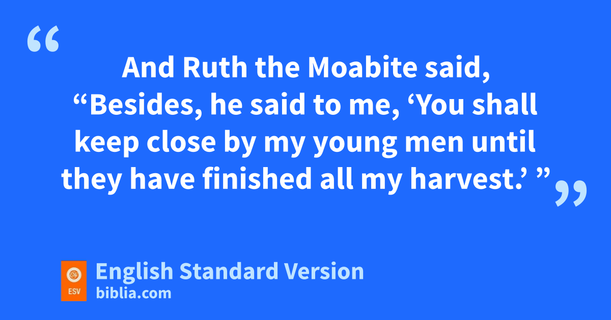 17 So she gleaned in the field until evening. Then she beat out what she had gleaned, and it was about an ephah2 of barley. 18 And she took it up and went into the city. Her mother-in-law saw what she had gleaned. She also brought out and gave her what food she had left over fafter being satisfied. 19 And her mother-in-law said to her, “Where did you glean today? And where have you worked? Blessed be the man gwho took notice of you.” So she told her mother-in-law with whom she had worked and said, “The man’s name with whom I worked today is Boaz.” 20 And Naomi said to her daughter-in-law, h“May he be blessed by the Lord, whose kindness has not forsaken ithe living or the dead!” Naomi also said to her, “The man is a close relative of ours, one of jour redeemers.” 21 And Ruth the Moabite said, “Besides, he said to me, ‘You shall keep close by my young men until they have finished all my harvest.’ ” 22 And Naomi said to Ruth, her daughter-in-law, “It is good, my daughter, that you go out with his young women, lest in another field you be assaulted.” 23 So she kept close to the young women of Boaz, gleaning until the end of the barley and wheat harvests. And she lived with her mother-in-law.
